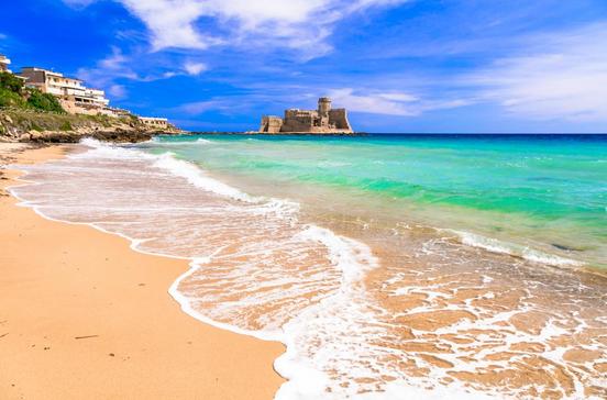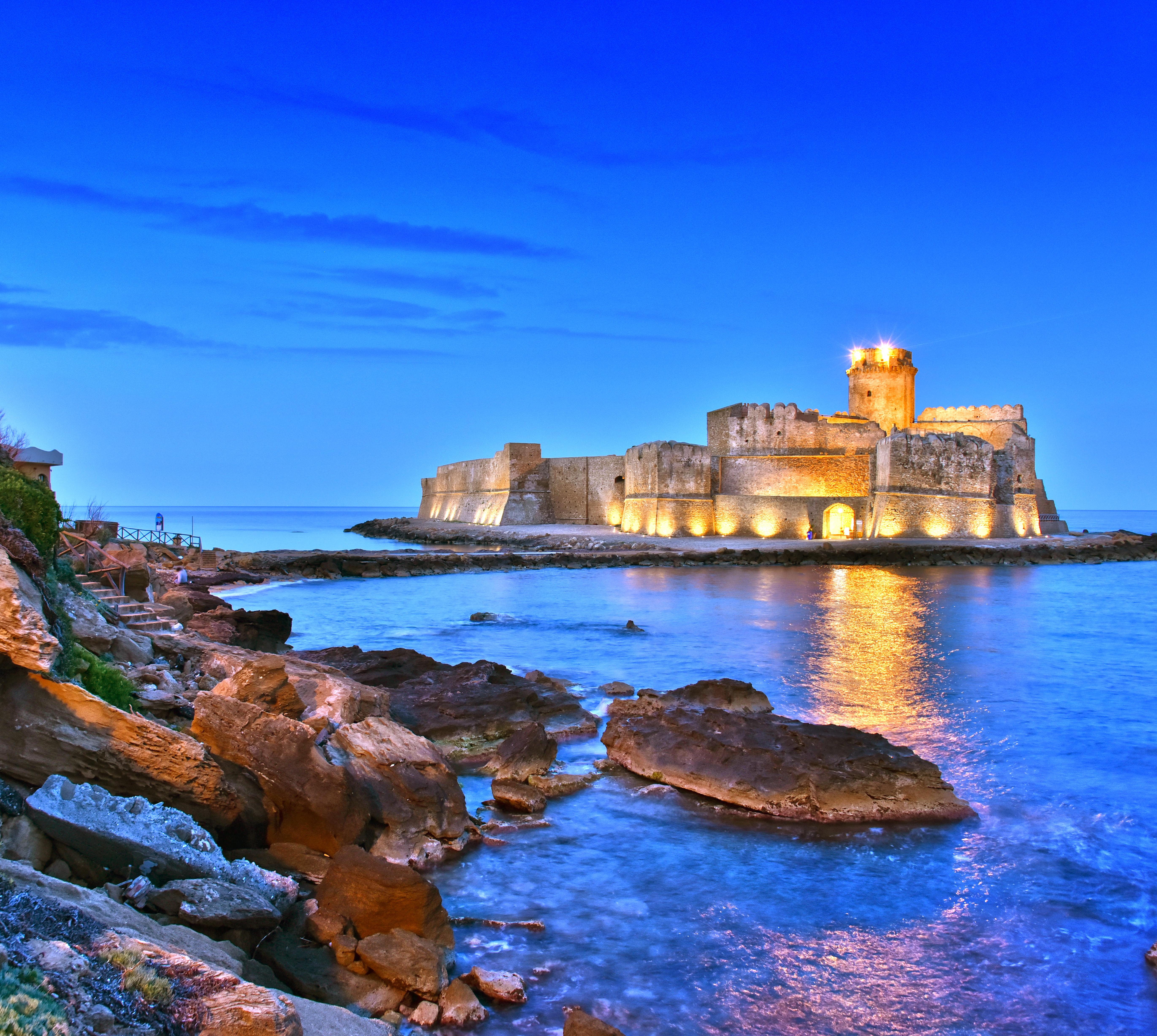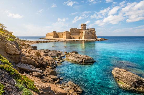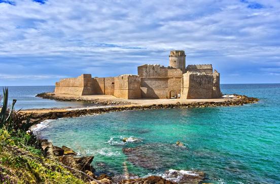 Eine Burg aus salzzerfressenem Sandstein im blauen Meer, ein paar moderne Ferienhäuser, gute Fischrestaurants und ein Piratendenkmal: Das ist Le Castella. Im Juli und August ein Touristenort, bleibt Le Castella, Ortsteil von Isola di Capo Rizzuto, den Rest des Jahres ein beschauliches Fischerstädtchen. Von hier aus kann man schöne Segeltouren in den Meerespark von Capo Rizzuto unternehmen.
