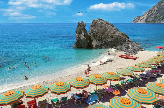 Der größte und angenehmste, weil bequemste ist der lange Sandstrand von Monterosso, der jedoch in der Hochsaison mit Badenden und Liegestühlen überfüllt ist. Gut zugänglich ist das Meer von den kleinen Hafenbuchten aus, außerdem gelangt man links von der Bootsanlegestelle von Riomaggiore zu einem richtigen Strand, allerdings aus Kies und Stein.