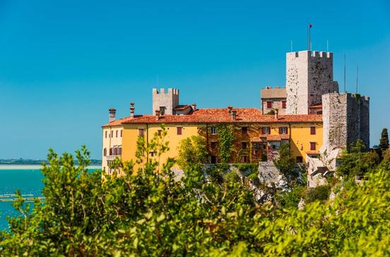Der Karst reicht dicht ans Wasser; hoch auf dem Felsen erhebt sich in atemraubender Lage das Schloss Duino, ursprünglich aus dem 14.Jh. und heute noch im Besitz der Adelsfamilie Thurn und Taxis. Hier, 20 km von Triest entfernt, war der Dichter Rainer Maria Rilke 1912 zu Gast, seine Spaziergänge in der Gischt des an die Felsen schlagenden Meers inspirierten ihn zu seinen „Duineser Elegien“. Der nach ihm benannte, berühmte Klippenspaziergang Sentiero Rilke beginnt an der Küstenstraße beim Touristenbüro von Sistiana und endet nach knapp 3 km in Duino. Hier im Ortskern geht es in die Burg mit ihren reich ausgestatteten Gemächern und einem schönen Park. Die Straße durchs Dorf führt hinunter an eine kleine, malerische Hafenbucht mit ein paar Fischerbooten, zwei Gasthäusern und zwei Restaurants. 4 km vor Duino geht es von der Küstenstraße ab hinunter an die Bucht von Sistiana mit Yachthafen, Strand und einigen Beachbars, die im Sommer beliebte Treffpunkte mit abendlichem DJ-Set sind. Von Duino weiter Richtung Monfalcone zweigt die Küstenstraße nach 2 km hin- unter ins Villaggio dei Pescatori ab, einen rustikalen Flecken mit Segel- und Motorbooten an der Mündung des Flusses Timavo, der ein wenig landeinwärts nach seinem langen unterirdischen Verlauf durch den Karst hier ans Tageslicht tritt. Direkt auf den Klippen überm Meer bekocht hier eine Fischerfamilie ihre Gäste im Al Pescaturismo