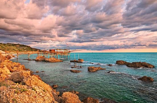 Südlich von Ortona, wo man in der Enoteca Regionale d’Abruzzo alle regionalen Weine verkosten kann, beginnt die sogenannte Costa dei Trabocchi, die vom fabelhaften Fahrrad- und Fußgängerweg Via Verde dei Trabocchi gesäumt wird. Trabocchi heißen die auf Holzpfählen aus dem Meer ragenden Fischfanghütten, vor denen sich von Zeit zu Zeit abgesenkte bzw. angehobene Netze übers Wasser spannen. Diese einst für die gesamte Adria charakteristischen Fischfangplattformen erlauben wetterunabhängiges Fischen. Die ersten standen im 14.Jh. in San Vito Chietino, wo bis heute die ältesten und schönsten Exemplare zu sehen sind. Einige servieren einfache, superfrische Fischküche, etwa das Trabocco Punta Fornace unterhalb von San Vito Chietino.
