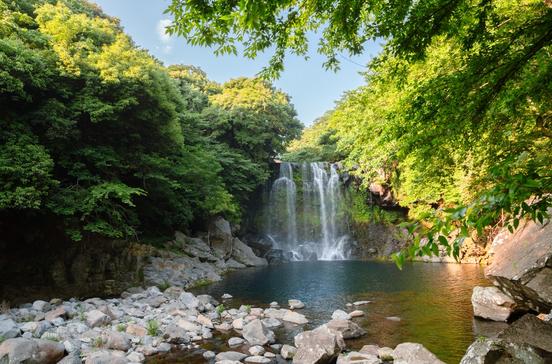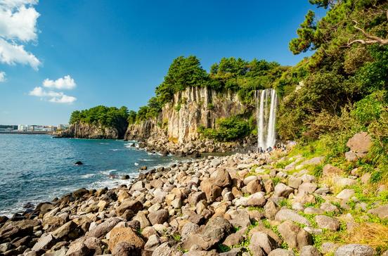 Rund 10 Min. musst du dem kleinen Wanderweg folgen, der an der Cheonjeong-ro nahe Jungmun-dong abzweigt, dann erreichst du einen der schönsten Wasserfälle der Insel. Aus 22 m Höhe stürzt er in die türkisen Fluten eines kleinen Sees. Nachts, wenn der Wasserfall beleuchtet ist, wirkt er noch mal so schön.