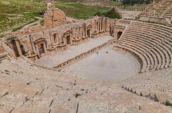 Das gut restaurierte Theater mit 32 Sitzreihen konnte etwa 5000 Zuschauer aufnehmen. In den ersten Reihen sind teils die Namen von Spendern eingraviert. Am besten kannst du das Theater bewundern, wenn du die Stufen hinaufsteigst. Von hier hast du einen weiten Blick auf die antike Stadt und Jerash. Bühne und Eingänge sind im korinthischen Stil geschmückt.