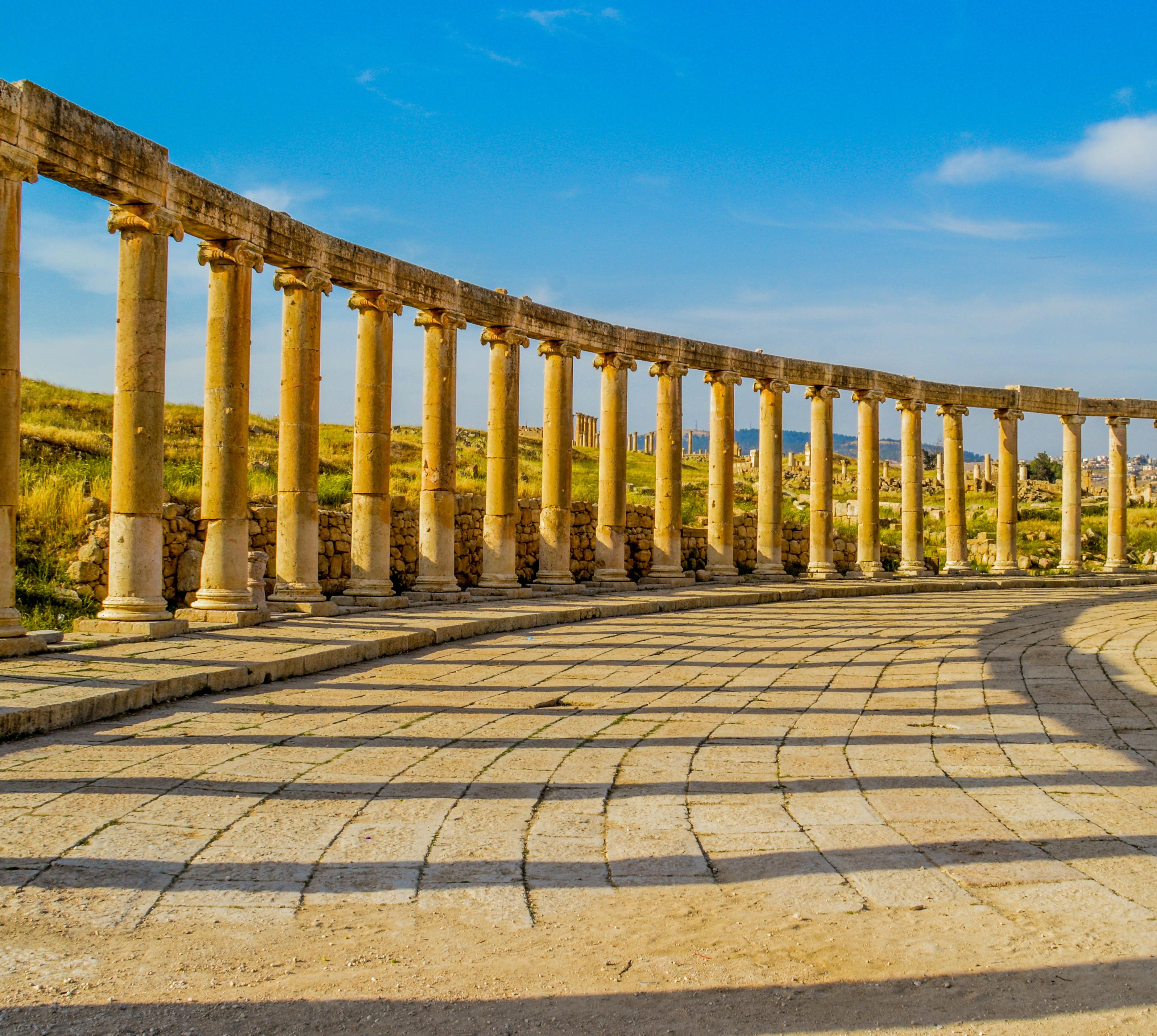 Jerash, das antike Gerasa, gilt als die weltweit besterhaltene römische Siedlung. Nach Petra ist sie die zweitwichtigste Touristenattraktion in Jordanien. Die Ruinen liegen etwa 50 km nördlich von Amman und können gut bei einem Tagesausflug besucht werden. Die aus rosa-orangefarbenem Kalkstein erbaute Stadt lag an einer der wichtigsten Handelsrouten der Antike. Umstritten ist, ob Gerasa von Alexander dem Großen oder einem seiner Feldherren gegründet wurde. Ihre Blütezeit erlebte die hellenistische Stadt jedoch unter römischer Herrschaft im 2.und 3.Jh. Der Besuch von Kaiser Hadrian 129 n. Chr. führte zu einem großen Bauboom und die Stadt wurde zum Wirtschaftszentrum der Provincia Arabica. Zu ihren Glanzzeiten lebten 20.000 Menschen in Gerasa. Unter byzantinischer Herrschaft begann der Verfall und im 9.Jh. wurde die Stadt endgültig verlassen. Doch in jedem Sommer wird sie zu neuem Leben erweckt: In den beiden Theatern werden Opern gespielt und Konzerte gegeben.