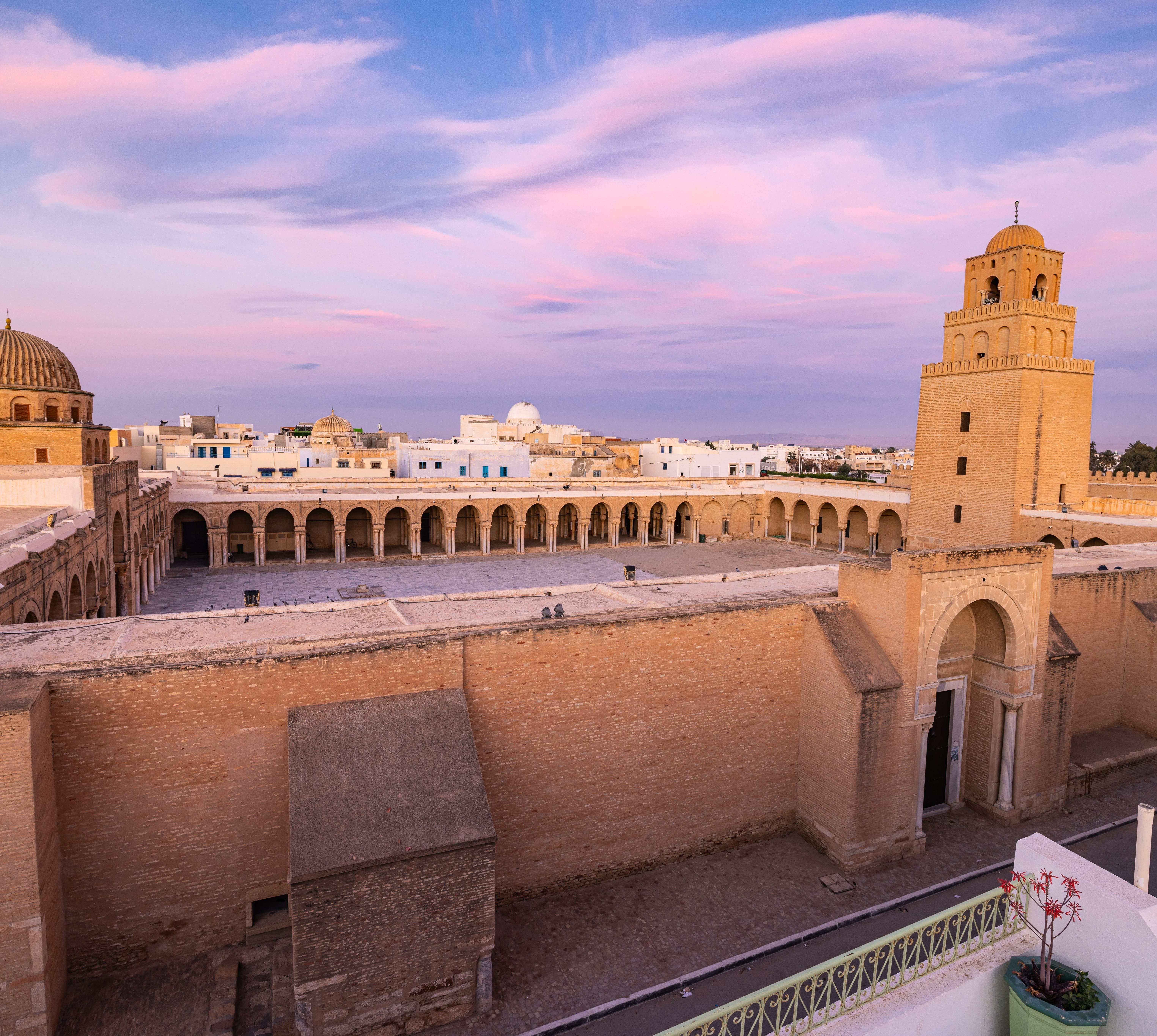 Nur wenige Bauwerke dokumentieren so eindrucksvoll die Herkunft des Islams wie diese aus Lehmziegeln errichtete, mehrmals umgebaute Moschee. Wie ein Bollwerk heben sich Mauern, Bastionen und Minarett fast schmucklos von der Stadt ab. Erdfarben und klare Linien rufen im marmorgepflasterten Innenhof zur Besinnung auf. Das Fundament des dreistufigen Minaretts stammt aus dem 8.Jh., die Arkaden wurden unter Verwendung antiker Säulenkapitelle im 9.Jh. erbaut. Gegenüber befindet sich der Gebetssaal. Durch eines der 17 mit Schnitzereien geschmückten Portale kannst du einen Blick ins Innere werfen, der Zutritt ist Nichtmuslimen verwehrt. 414 aus antiken Stätten hierher gebrachte Säulen unterteilen den dämmrigen Raum in 17 Schiffe. Den Toren gegenüber liegen Kiblawand und Mihrabnische, in deren Richtung sich die Gläubigen zum Gebet verbeugen. Die Mihrab ist das wertvollste Ausstattungselement der Moschee, sie ist ausgelegt mit Lüsterkacheln aus dem Zweistromland. Der 862 angefertigte Predigtstuhl daneben ist der älteste der islamischen Welt. Das Lalla-Rihana-Tor in der Ostmauer wird von antiken Säulen und mächtigen Hufeisenbögen gestützt und diente als Eingang für Privilegierte.