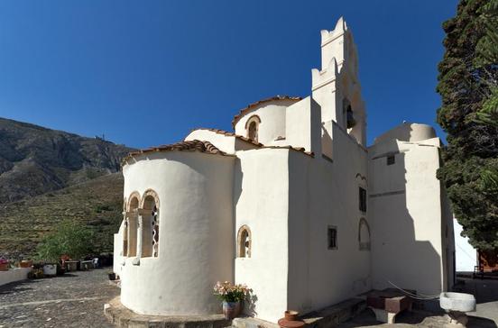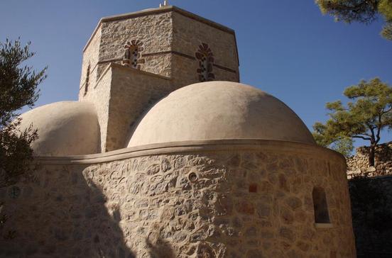 Diese Kirche stammt aus byzantinischer Zeit und gehört zu den ältesten Kirchenhäusern auf der ganzen Insel. Sie wurde um 1115 von Kaiser Alexos I. Kommenós gegründet. Zunächst diente sie als Sitz des orthodoxen Kirchenoberhaupts. Später wurde sie von der katholischen Kirche übernommen. Nach der Eroberung durch die Türken im 16.Jhd. wurde das Gotteshaus wieder der griechisch-orthodoxen Kirche übergeben. Feuer und Erdbeben machten der Kirche oft zu schaffen.