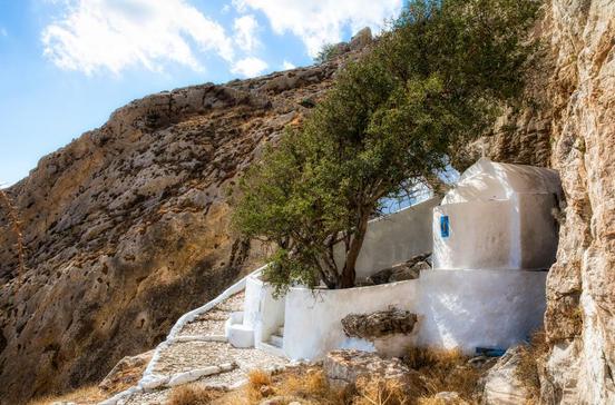 Du bist fit? Dann steig am besten gleich nach dem Frühstück hinauf zu der kleinen Kapelle, die 220 m hoch über Kamári thront. Von dort oben hast du einen grandiosen Ausblick auf den Ort und schaust von der kleinen, mit zwei Johannisbrotbäumen bestandenen Terrasse den Flugzeugen aufs Dach. Gleich neben der Kapelle kannst du in eine 10 m tiefe Felsgrotte gehen, in der eine Trinkwasserquelle entspringt.