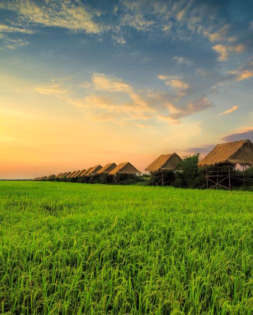Je nach Jahreszeit schimmern die Reisfelder in leuchtendem Grün, in Schlammbraun oder Goldgelb. Überall idyllisches Landleben auf den ersten Blick: Frauen und Männer beim Reisdreschen auf den Feldern, das karierte krama-Tuch zum Turban um den Kopf geschlungen, die Zähne und Lippen blutrot vom Saft der Betelnuss. Die meisten der rund 17 Mio. Kambodschaner sind Bauern, die vonder Hand in den Mund leben – ein extrem karges Dasein zwischen Ochsenkarrenund palmstrohgedeckten Pfahlhütten, Schuldenlast und Reisfeldern, aufdenen noch immer unzählige Minen lauern. Das Königreich Kambodscha gehörtmit einem jährlichenPro-Kopf-Einkommen von ca. 2200 US-Dollar immernoch zu den ärmsten Ländern der Welt – und das obwohl die Löhne in den letztenJahren stark gestiegen sind (mit riesigem Stadt-Land-Gefälle) und obwohlEdelsteine, Gold und sogar Erdöl zu den wichtigsten Wirtschaftsgütern zählen.