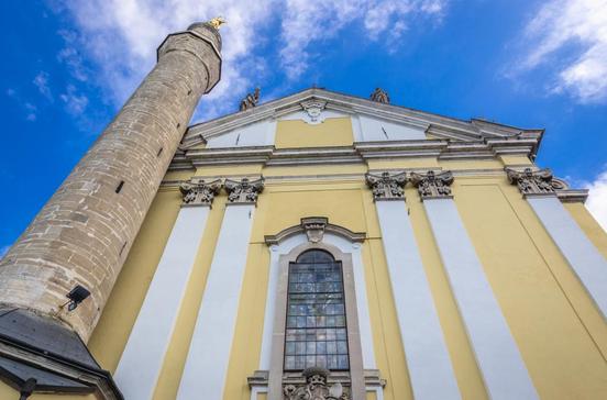 Durch das barocke Triumphtor (1781) gelangen Sie vom Markt in den Hof der Kathedrale. Die dreischiffige Basilika wurde 1502 fertiggestellt. 1672 stürmten die Türken das christliche Bollwerk, bis 1699 diente sie als Moschee. Das 36 m hohe Minarett (147 Stufen) blieb stehen, seit 1756 sitzt jedoch eine goldene Jungfrau Maria auf der Spitze. Im Garten grüßt Papst Johannes Paul II. aus Bronze.