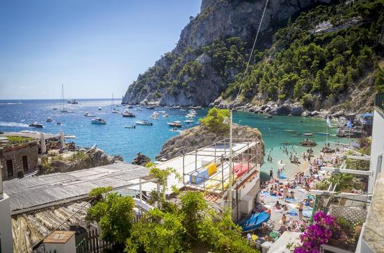 Gegenüber auf der Inselsüdseite in Marina Piccola und unterhalb der Punta di Tragara liegen auf Felsplatten einige exklusive Strandbäder wie das renommierte La Fontelina.