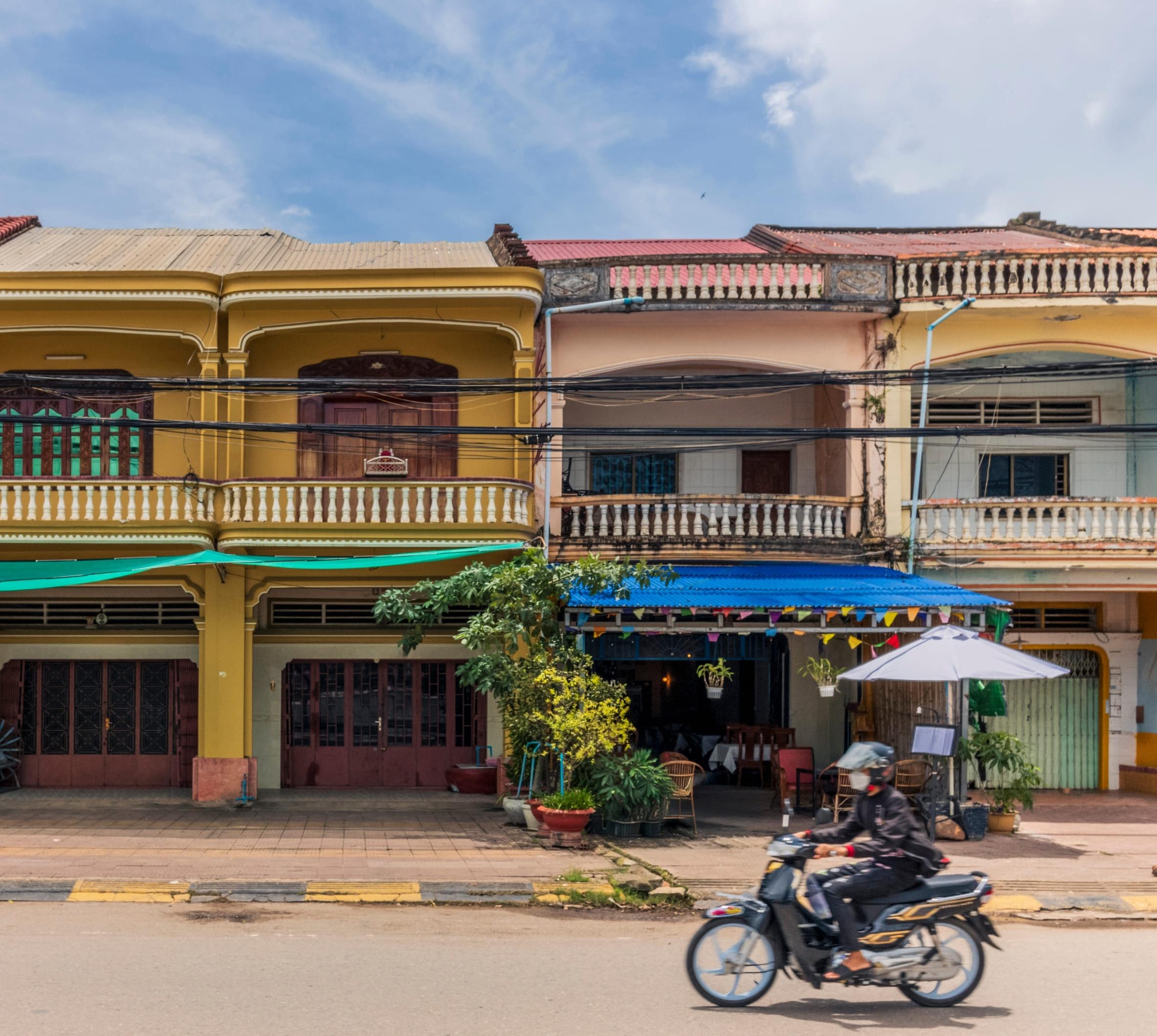Ein Hauch von Kolonialzeit weht durch das beschauliche Städtchen am Toek-Chhou-Fluss mit der palmenbestandenen Uferpromenade, gesäumt von kleinen Häuschen mit schattigen Arkadengängen und klapprigen blauen Fensterläden.
