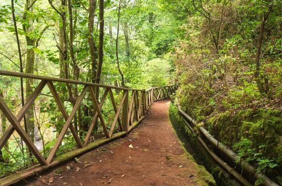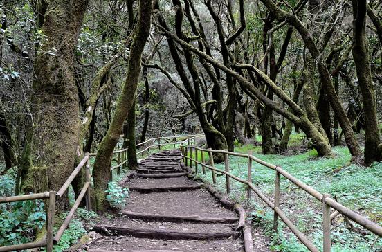 Wie eine Oase liegt dieser Mischwald aus Lorbeerbäumen und Baumheide in der wilden, zerrissenen Gebirgslandschaft, 900 bis 1400 m über dem Meeresspiegel. Einem grünen Kragen gleich schlingt er sich um den höchsten Gipfel, den Garajonay (1487 m), bedeckt den Grat der Insel und fließt gen Norden die steilen Hänge hinunter, wo er sich in unzugängliche Schluchten schmiegt. Ursprünglich war fast ganz La Gomera von diesen Wäldern bedeckt. Aber durch Kahlschlag und Rodungen wurden große Bestände vernichtet. Noch in den 1960er-Jahren gab es Bestrebungen, den gesamten Wald abzuholzen. Doch auf Betreiben von Naturschützern wurden die restlichen knapp 40 km2 Wald 1981 unter Naturschutz gestellt und zum Nationalpark erklärt. Vier Jahre später nahm die Unesco den in seiner Ausformung und Größe einmaligen Lorbeerwald in die Liste schützenswerter Naturgüter auf. Mittelpunkt des Nationalparks ist das Cedro-Tal, das sich vom Fuß des Garajonay Richtung Norden erstreckt. Ganzjährig fließt hier ein sprudelnder Bach, den besonders beeindruckende Lorbeerbäume säumen, umrankt von Efeu und behangen mit einem Gewirr aus Lianengewächsen. Der schmale Pfad entlang des steinigen Flussbetts führt immer wieder über kleine Holzbrücken, vorbei an Wasserfällen und einer verwunschenen Kapelle, die malerisch an einer Lichtung liegt.
