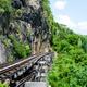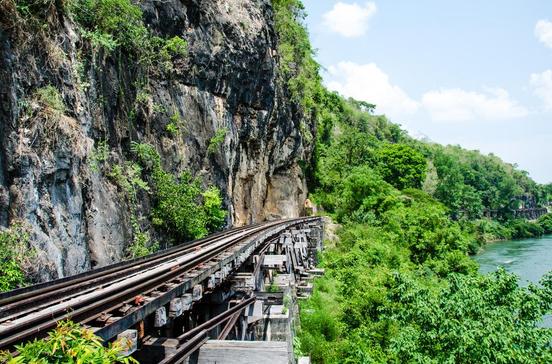 Der Bau der Bahnlinie von Kanchanaburi nach Myanmar kostete mehr als 12.000 westliche Kriegsgefangene der Japaner und über 80.000 asiatische Zwangsarbeiter das Leben. Der landschaftlich spektakuläre Teil der Strecke beginnt erst hinter der Brücke am Kwai. Hoch über dem Fluss geht es haarscharf vorbei an schroffen Felswänden und im Schritttempo über ein ächzendes Balkenviadukt beim Dorf Wang Po. Der letzte Haltepunkt Nam Tok ist ein verschlafenes Nest. Wenn man nicht zurückfahren will, kann man ebenso den Bus über den Sai-Yok-Nationalpark nach Sangklaburi nehmen.