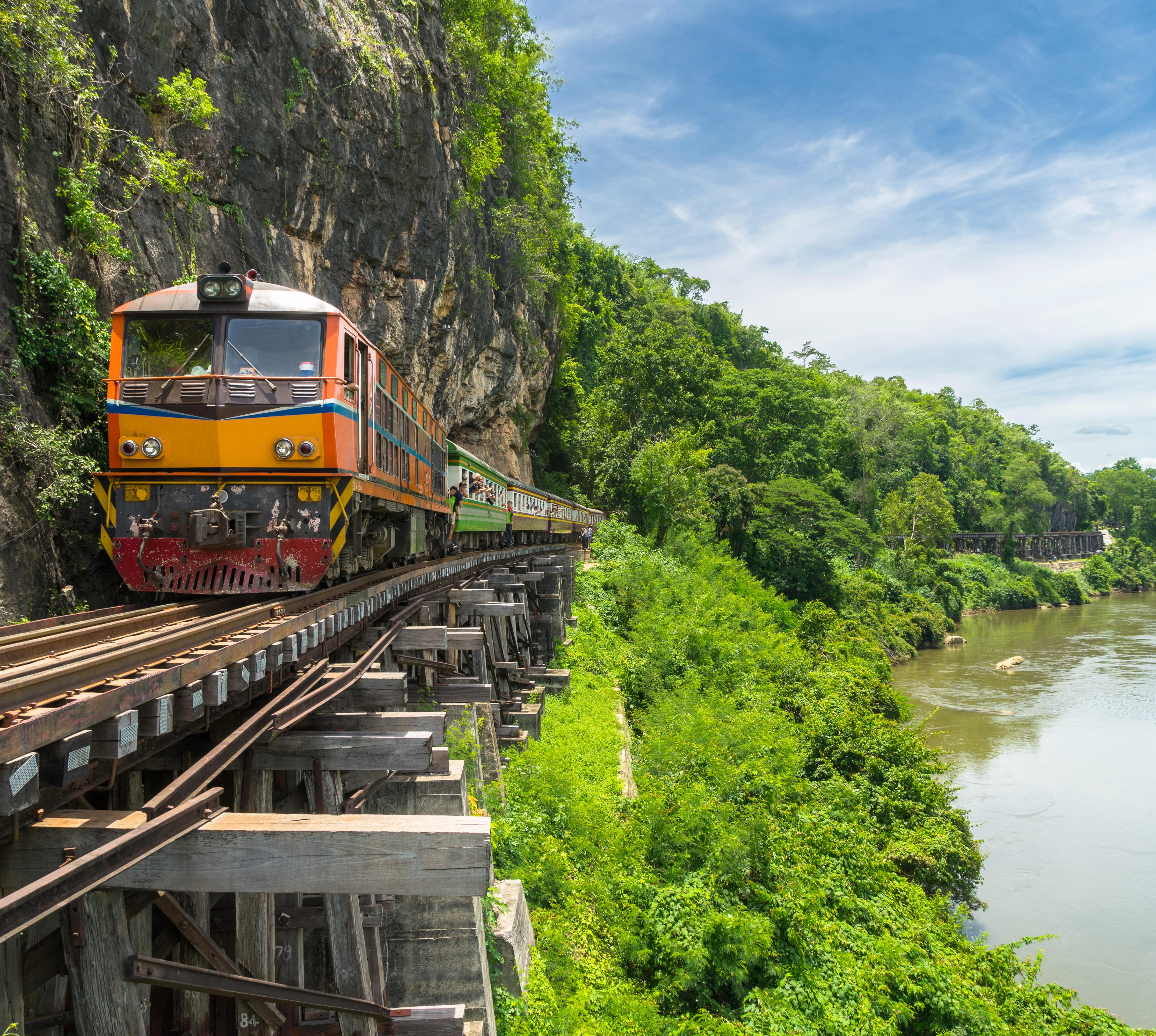 Der gleichnamige, oscarprämierte Filmklassiker mit Alec Guinness wurde zwar im Dschungel Sri Lankas gedreht, aber in Kanchanaburi, 130 km westlich von Bangkok, liegt der wahre Kriegsschauplatz mit der rekonstruierten japanischen „Todeseisenbahn“, deren Bau 1942–43 Zigtausende Opfer forderte. Zwei Sonderzüge fahren täglich ab Stadtteil Thonburi (Bahnhof nahe U-Bahn-Station Bang Khun Non) nach Kanchanaburi und bis zur Endstation Nam Tok (aktuelle Infos: Zugauskunft-Hotline 1690 | seat61.com).