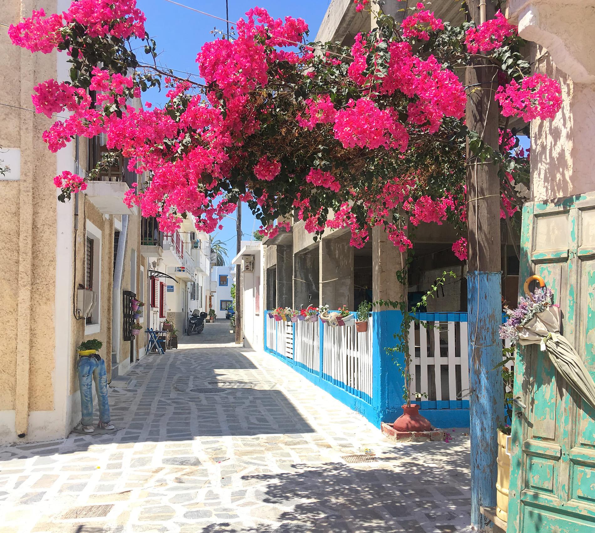 Ein paar Snacks, was Süßes oder ein frischer Salat tun’s auch? Dann sitzt du bei Jack und Dimítri genau richtig – unter duftendem Jasmin auf farbenfrohen Polstern vor einem der ältesten noch erhaltenen Häuser des Orts, 1943 erbaut. Und wenn du zu Fuß da bist: Weine aus ökologischem Anbau sind eine Spezialität des Hauses.