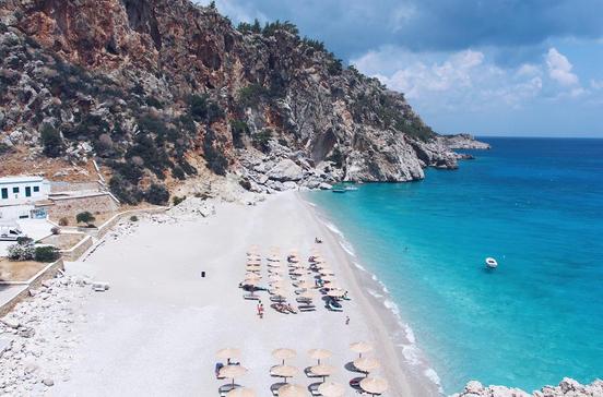 Der 300 m lange, vier Liegestuhlreihen breite, feinsandige Strand wird von bizarren Felsen gersäumt, das Wasser schimmert türkis.