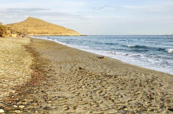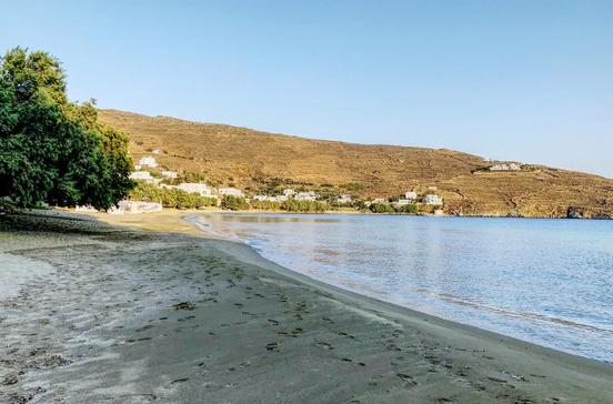 Der schönste Inselstrand ist der 600 m lange Àgios Romanós Beach an der Südküste mit sehr flach abfallendem Ufer, viel Baumschatten, kleiner Beachbar und guter Taverne.