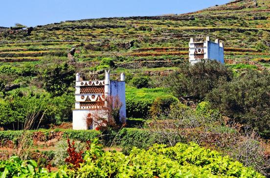 Landschaftsprägende Taubenhäuser stehen zu Hunderten auf den Feldern überall auf der Insel. Ihre Wände sind kunstvoll mit Rhomben, Dreiecken, Kreisen und anderen geometrischen Motiven aus dünnen Schiefer- oder Marmorplättchen verziert.