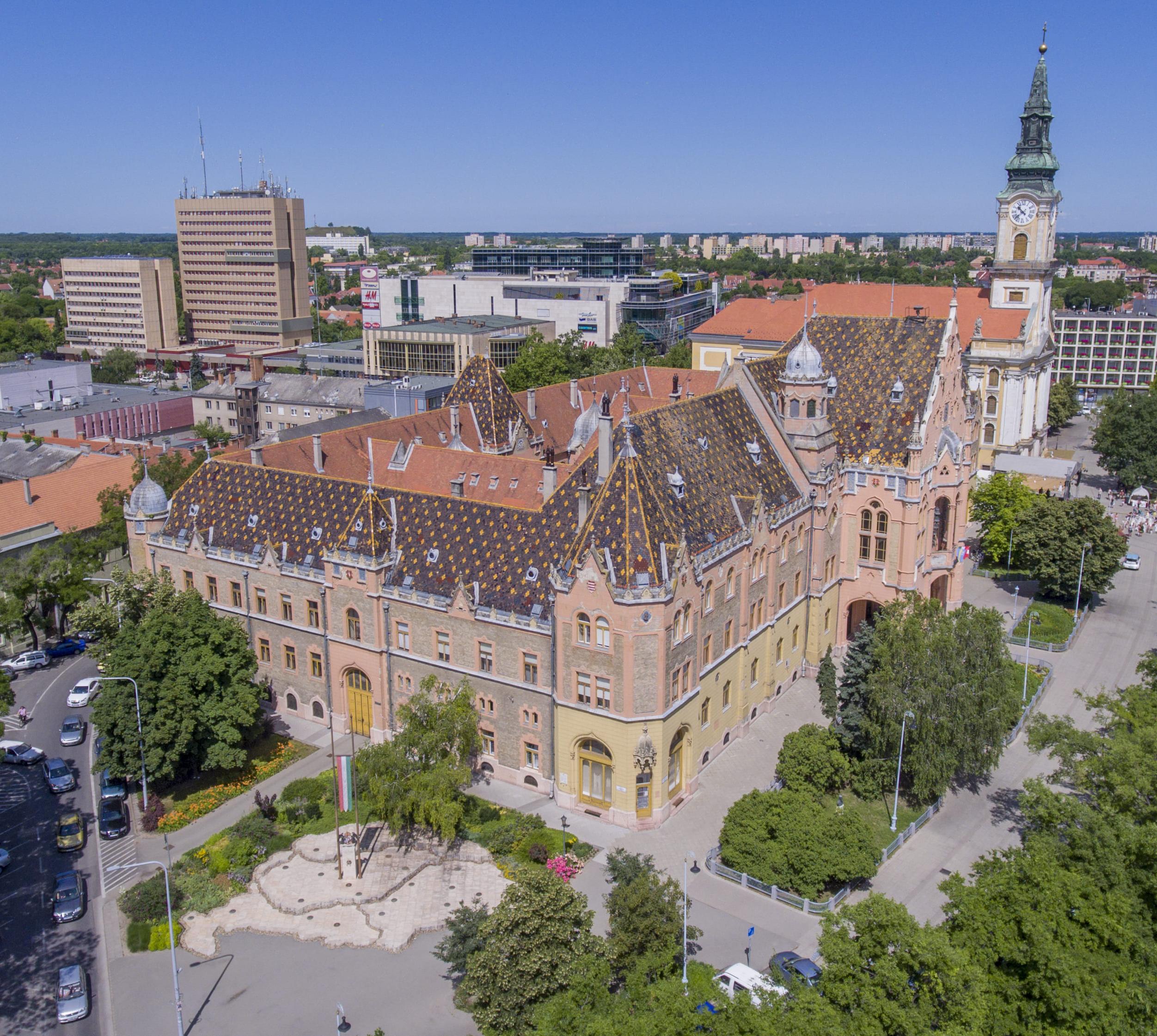 Eine Perle des ungarischen Jugendstils ist das Rathaus (174 Räume) mit seinen glasierten Dachziegeln, der majolikaverzierten Fassade, dem aufstrebenden Giebel (mit Ziegenbock-Stadtwappen) und den Türmchen. Das Meisterwerk wurde 1893-97 von den Architekten Ödön Lechner und Gyula Pártos gebaut. Dreimal am Tag ertönt vom Rathausturm ein schönes Melodienmedley.