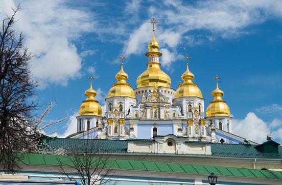 Das himmelblaue Kloster wurde 2001 wiedererrichtet. 1937 hatte Stalin es sprengen lassen. Er brauchte Platz für sozialistische Prachtbauten im Stil des benachbarten Außenministeriums mit dem Säulenportal. Der vergoldete Erzengel Michael über dem Eingang der Kathedrale ist eine Kopie. Das Original hängt im Museum, in dem viele Erklärungen englisch gehalten sind. Vor dem Kloster erinnert ein Steinkreuz mit der Silhouette eines Verhungernden an die Millionen Opfer der Hungersnot 1932–33.Metro: Soloti Worota o. Majdan. Hinter dem Kloster fährt die Standseilbahn Funikuljor hinunter zum Flusshafen in Podil.