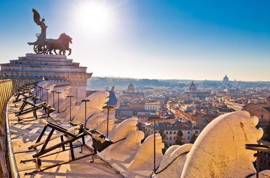 Von der Terrazza delle Quadrighe, der obersten Terrasse mit den dekorativen Bronzerössern, hat man einen herrlichen Blick auf das Forum Romanum und das gesamte Zentrum.