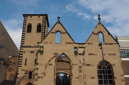 Von einer der ältesten Pfarrkirchen sind seit 1945 nur noch Ruinen übrig. Mit der Kopie der Skulptur "Trauerndes Elternpaar" von Käthe Kollwitz (1931) im Innenhof ist die Ruine heute Gedenkstätte für die Toten der Weltkriege.