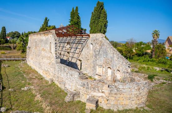 Gegen Ende des 5.Jhs. erbauten die frühen Christen Korfus über den noch erkennbaren Resten eines kleinen römischen Musiktheaters, eines Odeons, eine fünfschiffige Basilika, von der im Boden Spuren erhalten sind. Sie war ursprünglich mit prächtigen Bodenmosaiken geschmückt, von denen es noch schöne Fragmente in einem Ausstellungsraum in der Alten Festung gibt. Die eindrucksvollen, unter Verwendung antiker Bauteile errichteten Mauern stammen von einer kleineren gotischen Kirche aus venezianischer Zeit.