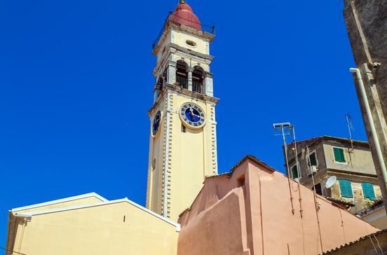 Die von Gläubigen mit wertvollen Weihgaben überhäufte Kirche ist dem Inselschutzheiligen gewidmet. Ihr kostbarster Besitz sind die Gebeine des heiligen Spiridon, eines zypriotischen Märtyrers aus der Zeit um 300.Die Reliquie gelangte 1456 durch Kauf nach Korfu, wo der Heilige im Lauf der Jahrhunderte zahlreiche kleine und große Wunder bewirkt haben soll. Das Kircheninnere wurde im 18.und 19.Jh. ganz im Stil der Ionischen Malschule ausgeschmückt - also mit Deckenmalereien und Ikonen, die nicht mehr in der Tradition von Byzanz stehen, sondern sich ganz an westlichen Vorbildern orientieren. In der rechten Seitenkapelle hinter der Ikonostase steht der mit getriebenem Silber verkleidete Ebenholzsarkophag des heiligen Spiridon. Den ganzen Tag über kommen Gläubige jeden Alters, entzünden eine Kerze, küssen den Sarkophag und schreiben einen Wunsch oder Dank an den Heiligen in ein ausliegendes Buch. Über dem Sarkophag hängen von Gläubigen gestiftete silberne Öllampen. Einige davon sind deutlich als Gaben von Seeleuten und Reedern zu erkennen: Silberne Schiffsmodelle oder Votivtäfelchen mit Schiffsreliefs zieren sie.