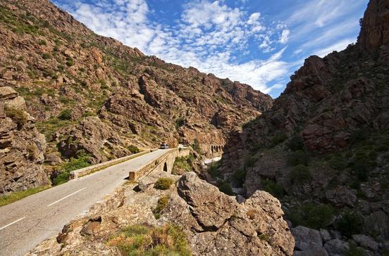 Die teilweise spektakuläre Straße „Treppe der heiligen Königin“ durch die wild zerklüftete Schlucht (D 84) windet sich abenteuerlich eng an Felsnasen vorbei, auf halber Höhe zwischen dem tief unten fließenden Golo und rotgrauen Granit-spitzen der Steinwüste. An einer Brücke über einen Nebenfluss des Golo, an einer kleinen, ausgeschilderten Parkbucht, gelangst du auf den instand gesetzten Maultierpfad, der bis 1889 die einzige Verbindung aus dem Niolo nach Osten war.