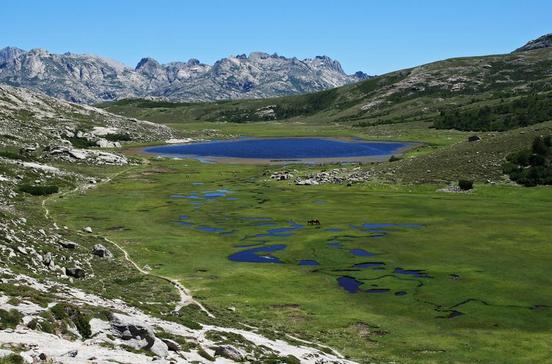Auf den moorigen Wiesen fängt der Sonnentau Mücken und überall gluckert es: Die pozzi sind eine blaugrüne Wasserlandschaft im Herzen grauer Bergriesen. Rechne mit drei Stunden Auf- und zweieinhalb Stunden Abstieg vom Col de Verde an der D 69.In den Bergeries des Pozzi verkauft der Hirte Jean-François Käse und Joghurt aus der Milch seiner Tiere.