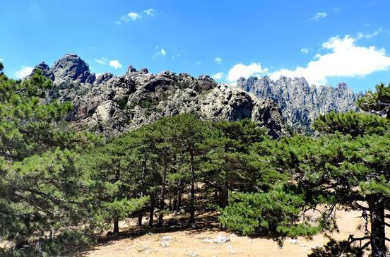 Am Pass von Bavella eröffnet sich die schönste Aussicht auf die Aiguilles de Bavella, deren Felsspitzen auch "Eselsohren" genannt werden. Auf Wanderungen lässt sich das wildromantische Berg-Massiv am schönsten erkunden. Vom Pass führt ein Weg zu den Hochwiesen, wo im Frühling die Kräuter duften.