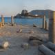 Zum Sonnenbad in die Kirche? Gegenüber vom kleinen Inselchen Kastrí ist es möglich. Da kannst du deine Strandmatte zwischen Säulen und 1500 Jahre alten Mauern ausrollen und bist schon zehn Schritte weiter im Wasser. Italienische Archäologen haben einige Säulen restauriert und wieder aufgerichtet – die meisten davon sind jedoch erneut umgefallen. Man erkennt noch den Grundriss des dreischiffigen Baus. An die Nordwand angelehnt stand eine zweite, kleinere Basilika mit einem noch immer sehr gut erhaltenen, kreuzförmigen Taufbecken im Boden. Hier gefundene Bodenmosaike wurden wieder mit Kies bedeckt.