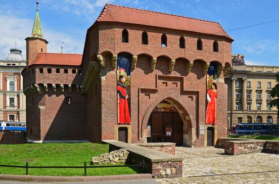 Krakau war im Mittelalter mit doppelten, bis zu 3 m breiten Mauern und 47 Wehrtürmen befestigt. Um diese Basteien kümmerten sich die jeweiligen Zünfte und lagerten dort auch teilweise ihre Waffen. Rund um die Mauern war ein tiefer Wassergraben angelegt, im 15.Jh. kam die Barbakane hinzu, eine runde Befestigungsanlage mit Planken und sieben schlanken Türmchen. Im 19.Jh., als in den meisten großen europäischen Städten die mittelalterlichen Wehranlagen abgerissen wurden, sollten auch in Krakau die Befestigungen abgetragen werden. Heute ist deshalb nur ein kleiner Teil der inneren Mauern mit zwei Basteien und dem Arsenal, der Barbakane und dem Haupteingangstor erhalten. Die Wehranlagen sind nur von außen zu besichtigen, aber man kann die Barbakane und die Mauern besteigen: Die höheren Etagen bieten eine interessante Aussicht.
