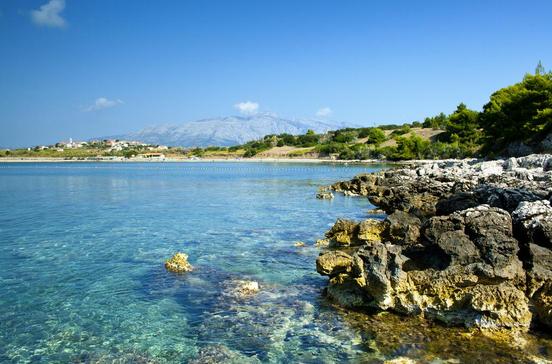 Der Kiesstrand Martinšćica liegt im Schatten von Bračs berühmtem Goldenen Horn, nahe der Stadt Bol. Eine sanft geschwungene Bucht, kristallklares Meer und auf der Landzunge ein idyllisches Kloster zeichnen diesen typisch dalmatinischen Strand aus.