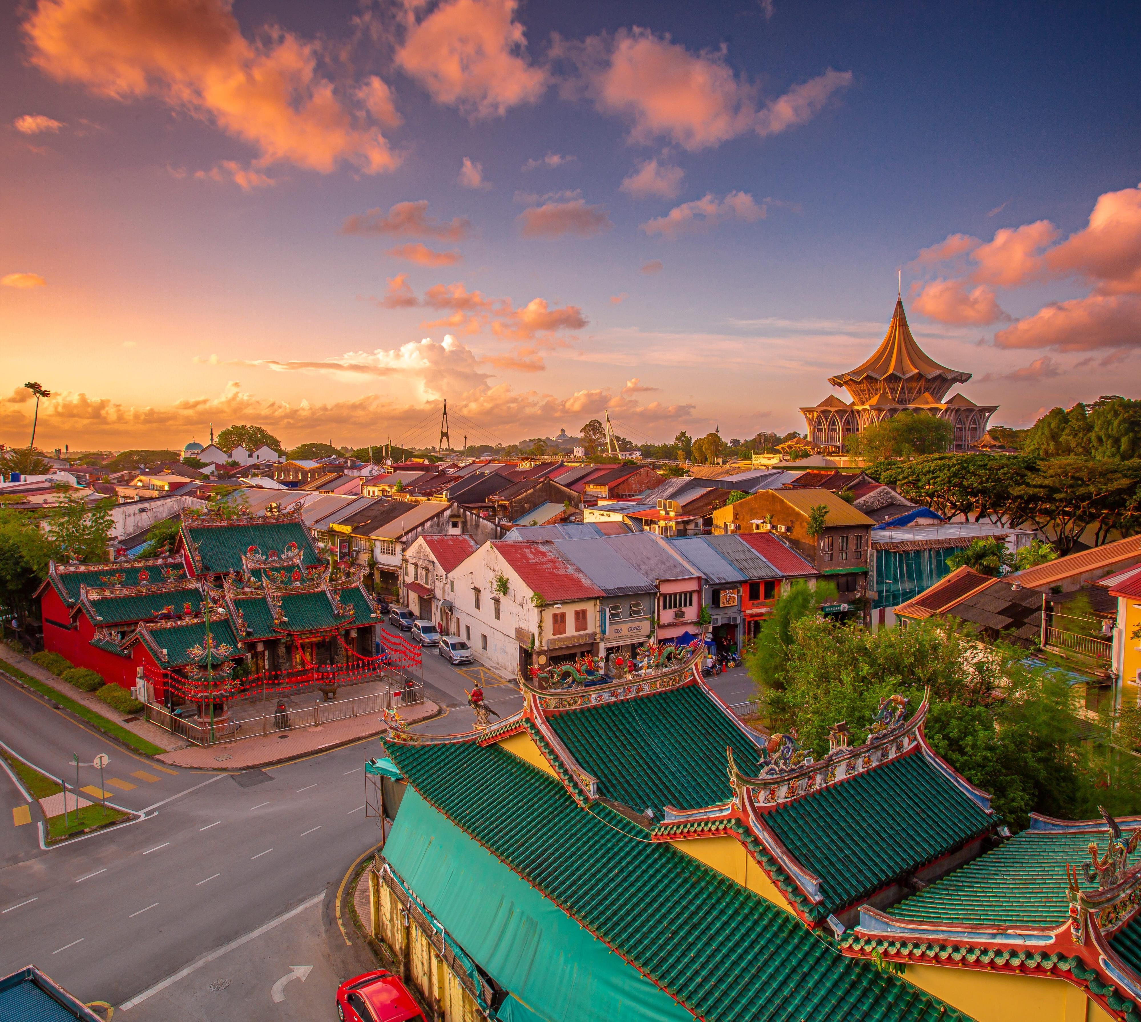 In den kleinen Straßen entlang des Flusses stehen hübsche Tempel, historische Gebäude und die traditionellen chinesischen shophouses. In den Geschäften und auf den Märkten findest du feines Kunsthandwerk aus der Region. Der Sarawak-Fluss teilt die Stadt: Den Süden prägen der koloniale und der chinesische Einfluss sowie die Geschäftswelt. Im Norden wohnen mehrheitlich Malaien. Hier stehen am Flussufer traditionelle kampung-Häuser neben modernen Verwaltungsbauten. Die beiden Teile sind so unterschiedlich, dass sie sogar jede einen eigenen Bürgermeister und ein eigenes Rathaus haben.