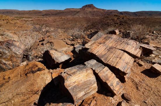 Der heute versteinerte Wald, den man 45 km nordöstlich von Twyfelfontein findet, wuchs eigentlich viel weiter nördlich. Vor 260 bis 280 Mio. Jahren wurden die Stämme aus Zentralafrika hierher gespült. Die Konturen des Holzes sind unglaublich detailgenau in Stein übergegangen, selbst Jahresringe, Borke und Astlöcher sind noch zu erkennen. Weil der pflanzliche Kohlenstoff Molekül für Molekül hauptsächlich durch Mangan und Eisen ersetzt wurde, sind die Bäume doppelt so schwer wie das umliegende Gestein.