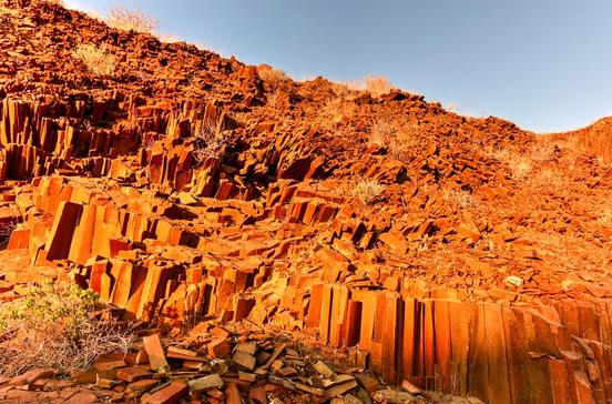 Die Kirche fehlt, hier steht nur die Orgel: In einer kleinen Schlucht 10 km östlich von Twyfelfontein finden sich eckige Doleritsäulen – Basaltgestein, das einst flüssig in Erdspalten emporschoss. Wie Orgelpfeifen heben sie sich als Überbleibsel der Erosion bis zu 5 m hoch aus dem sandigen Flussbett. Der frühe Vogel fängt hier den Wurm, denn die Schattenspiele der aufgehenden Sonne sind besonders beeindruckend.