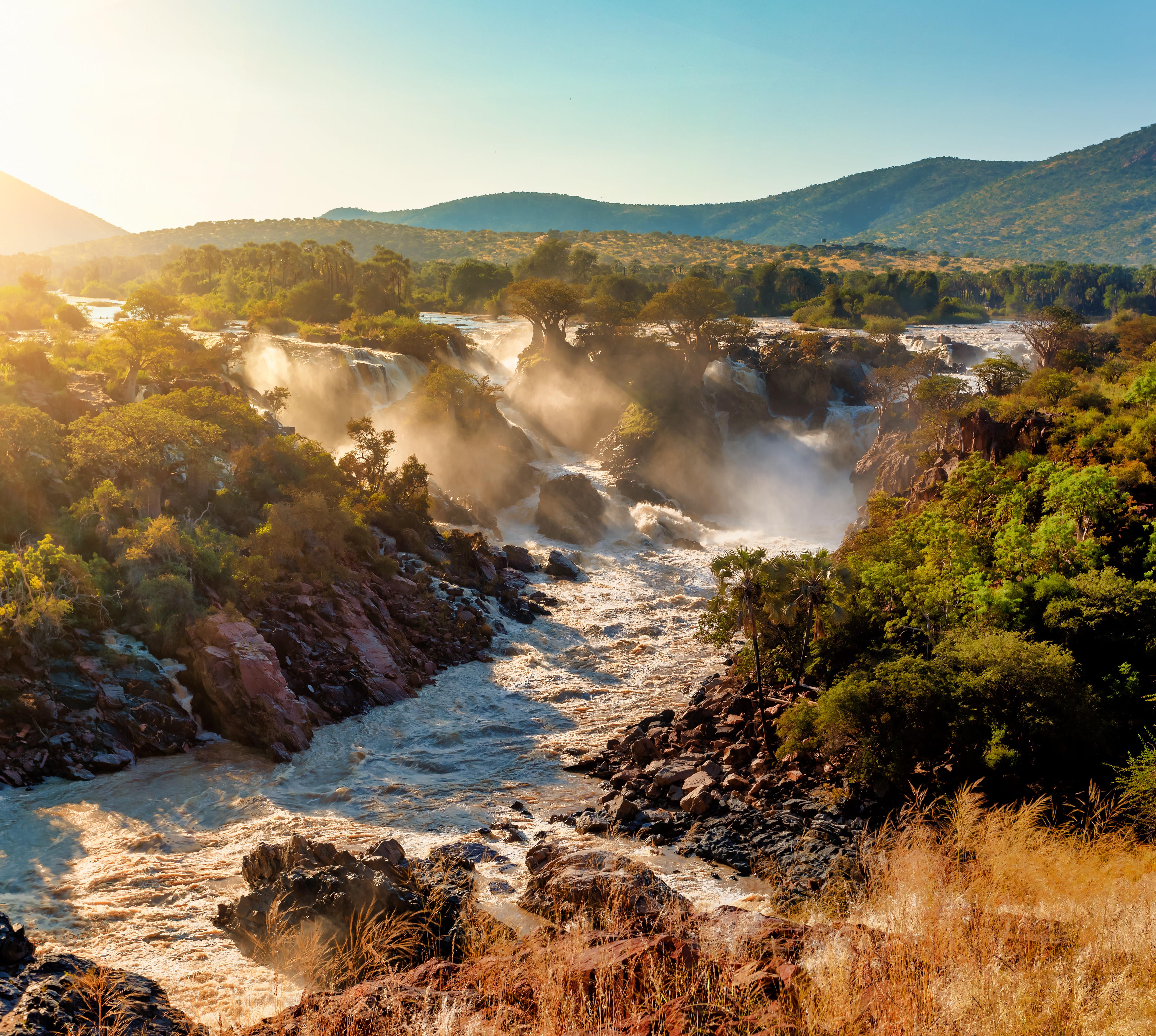 An den Epupa Falls stürzt der Kunene auf insgesamt 700 m Breite inmitten ansonsten karger strauchlandschaft rauschend und schäumend 35 m in die Tiefe. Nördlich des Flusses liegt Angola, südlich das namibische Kaokoveld. Am Abgrund der Fälle klammern sich Affenbrotbäume an die Felsen, die kleinen Inseln und Ufer des Stroms sind gesäumt von Makalanipalmen, aus deren Samen die Einheimischen Souvenirs schnitzen. Im Mai, nach der Regenzeit, ist das Schauspiel der Wasserfälle am eindrucksvollsten, der Anblick zum Sonnenuntergang majestätisch.