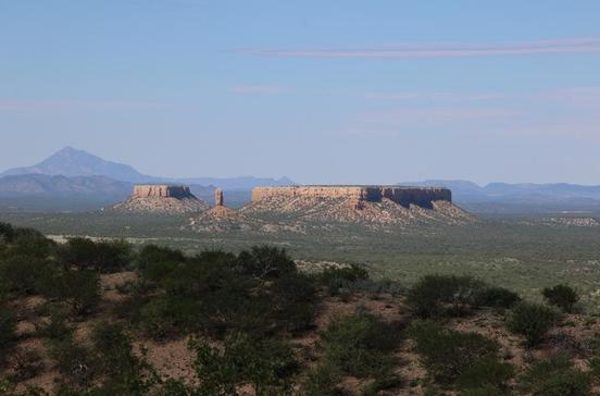 30 Mio. Jahre Erosion haben vom Gestein auf der Ebene nur noch einen Finger stehen lassen – eine 35 m hohe Klippe, die die Landschaft überragt (165 km östlichvon Twyfelfontein).