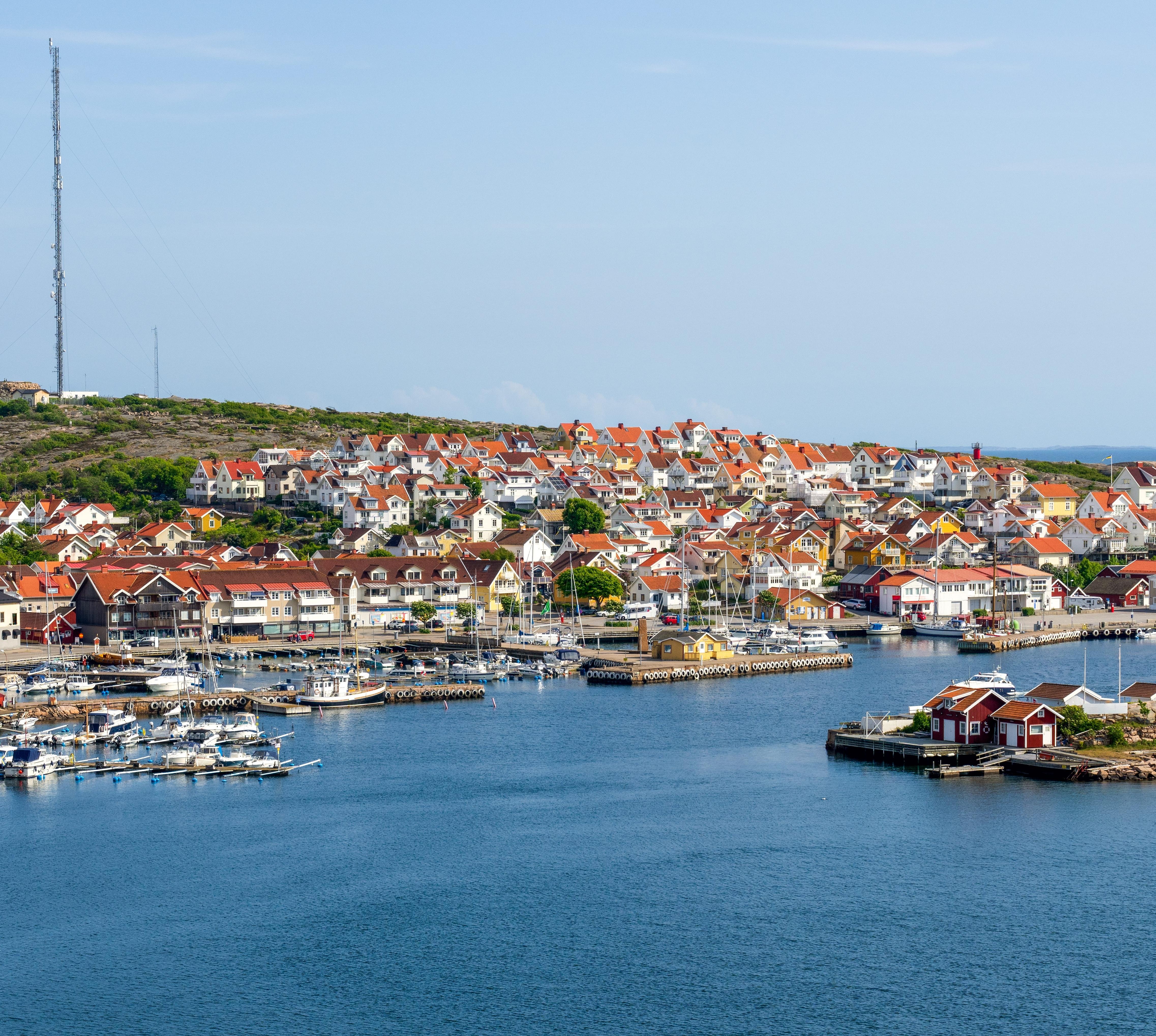 Smögen an der Spitze der Halbinsel Sotenäs ist noch immer ein Fischerort, was man aber während der Saison kaum bemerkt, denn dann schieben sich Touristenmassen über den berühmten, 1 km langen, mit bunten Bootsschuppen bestandenen Holzsteg, vor dem dicht an dicht gedrängt die Boote liegen.