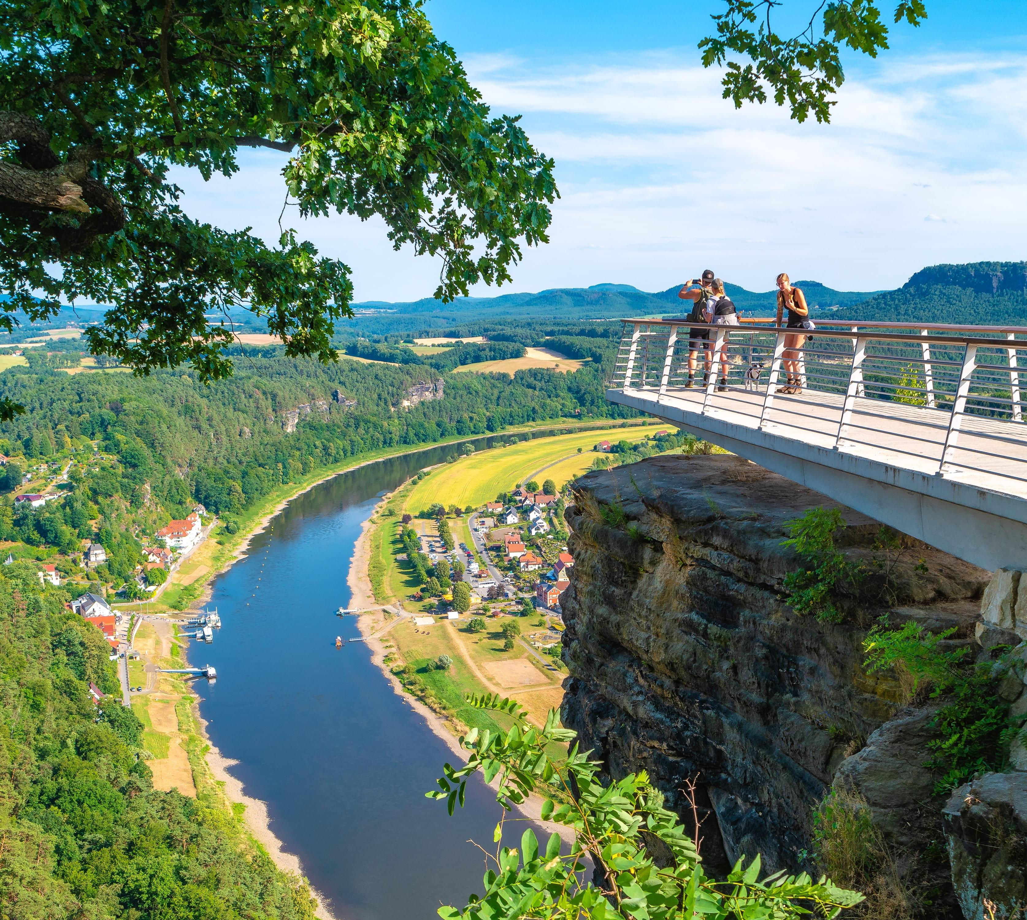 Über die Schwedenlöcher, einen von steilen Felswänden gesäumten Wanderweg, gelangt man vom Kurort Rathen zur berühmtesten Aussichtsplattform der Sächsischen Schweiz: 190 m hoch erhebt sich der Basteifelsen über die Elbe.