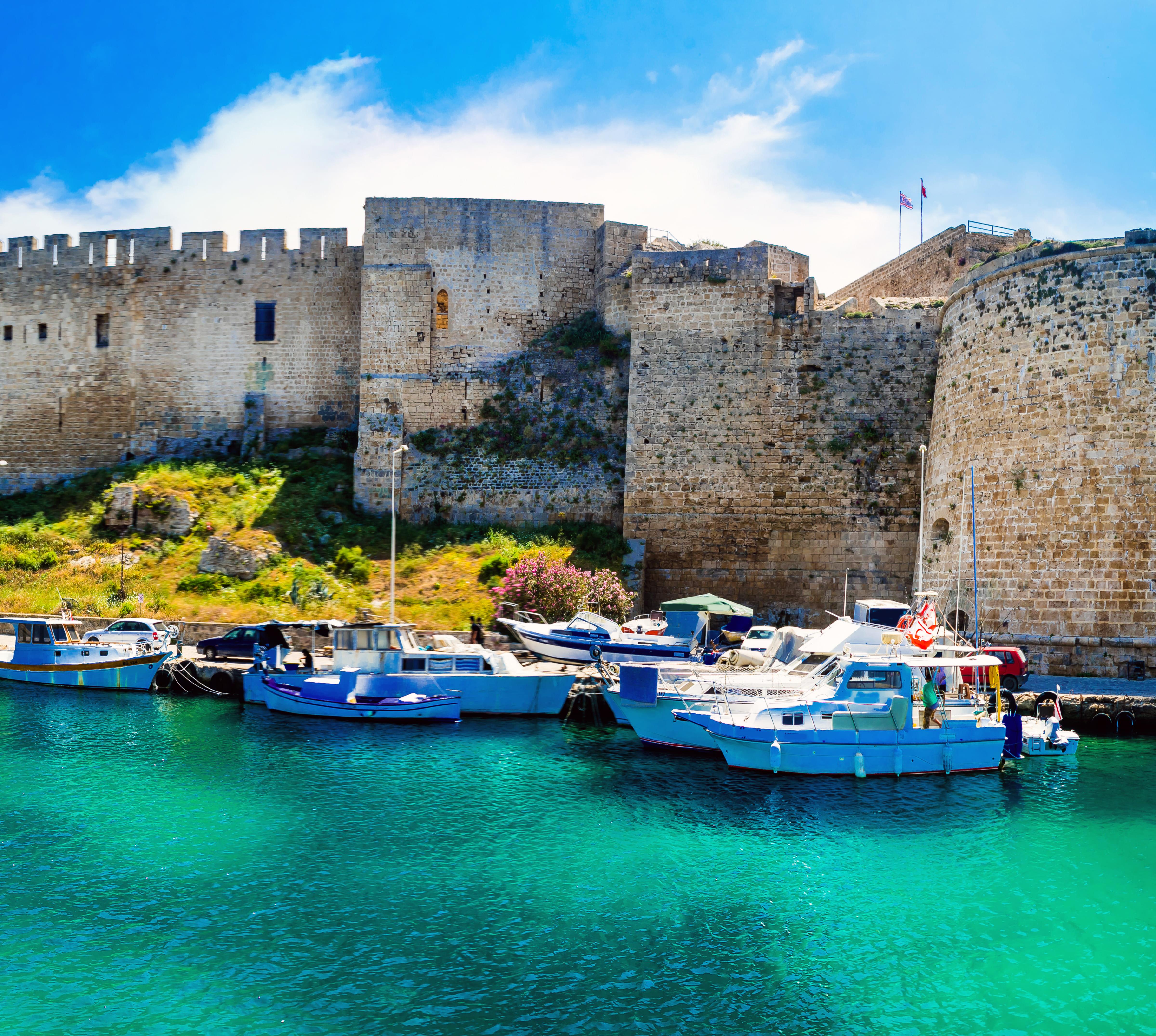 Zyperns schönste Stadt, auf Türkisch heißt sie heute Girne, liegt jenseits der schmalen Kette des Kerýneia-Gebirges. Ihr Zentrum ist das kleine, fast kreisrunde Hafenbecken aus venezianischer Zeit. Das Ufer säumen Cafés und Restaurants, dahinter erheben sich jahrhundertealte Häuser. Eine mächtige Festung nimmt eine Seite des Hafens ein. Innerhalb der Altstadt ragen ein Kirchturm und ein Minarett auf. Gleich hinter dem Ort steigt die Landschaft steil zum Gebirge an. Die alpin anmutenden Gipfel des Pendedáktilos sind ein berauschender Anblick. Die schmale Ebene entlang der Nordküste steht voller Zitronen- und Orangenbäume.