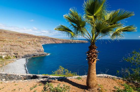 Zwischen gerundeten Bergflanken führt das mit Palmen bestandene Barrancobett zu einem von Kies durchsetzten Lavastrand. Er ist beidseitig von vorragenden Klippen gesäumt, sodass sich eine geschützte Bucht ausbildet. Hier kannst du gut ins transparente, türkis schimmernde Wasser steigen.