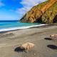 Der Kiesstrand liegt geschützt in einer Bucht und ist meist dennoch einer wilden Brandung ausgesetzt. Die Landschaft ist wunderschön.