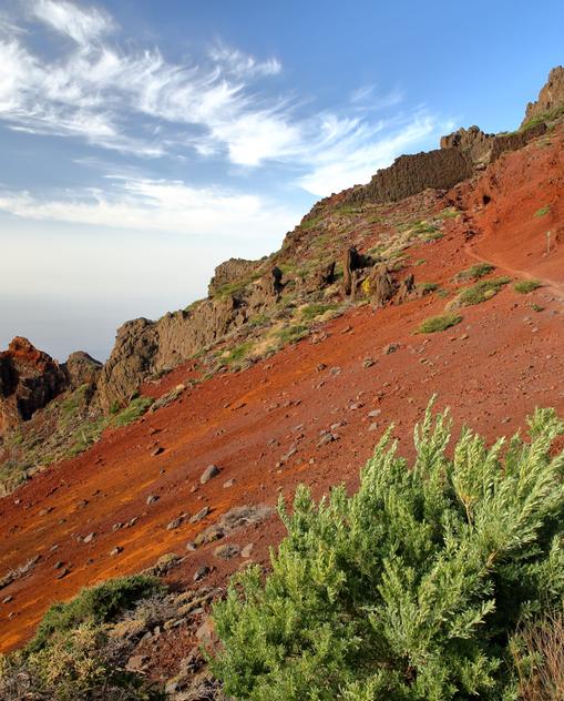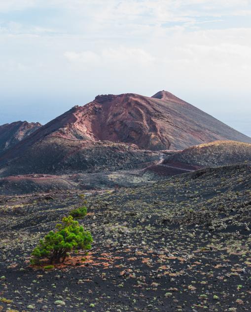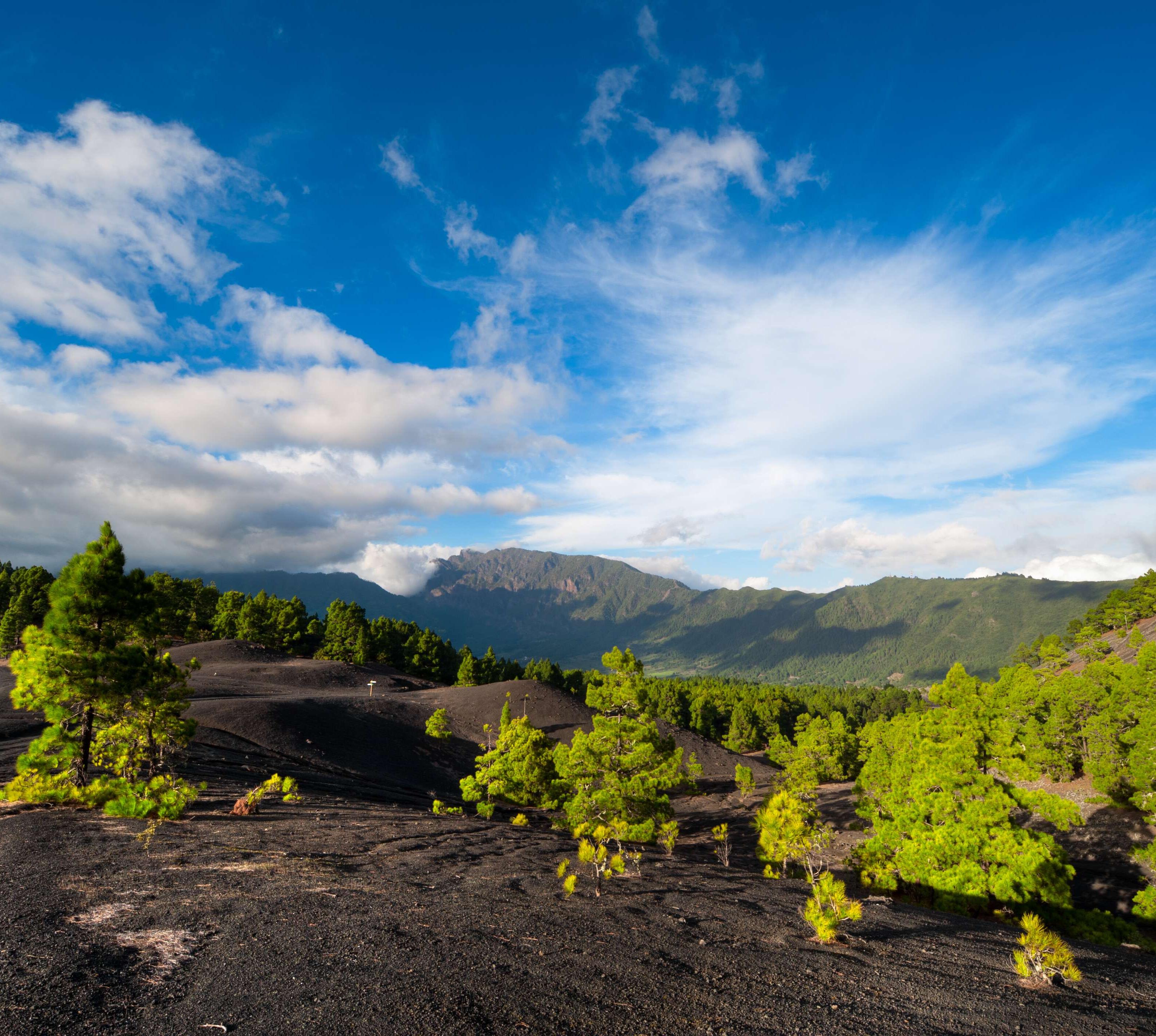 La Palma ist vulkanischen Ursprungs – das hat der große Ausbruch 2021/22 wieder einmal vor Augen geführt. Ein neuer Vulkan erhob sich aus dem Schoß der Erde, spie Feuer und Asche und begrub mit seiner Lava ganze Ortschaften im Südwesten. Er erhielt den altkanarischen Namen Tajogaite. Hier und im Süden der Insel, wo 1971 der Teneguía ausbrach, präsentiert sich die Insel mit dunklen, kegelgespickten Hängen. Nicht so im Norden, wo üppiger Lorbeerwald wächst. Und im Zentrum befindet sich einer der größten Erosionskrater, aus dessen steilen Klippen Kiefern ragen.
