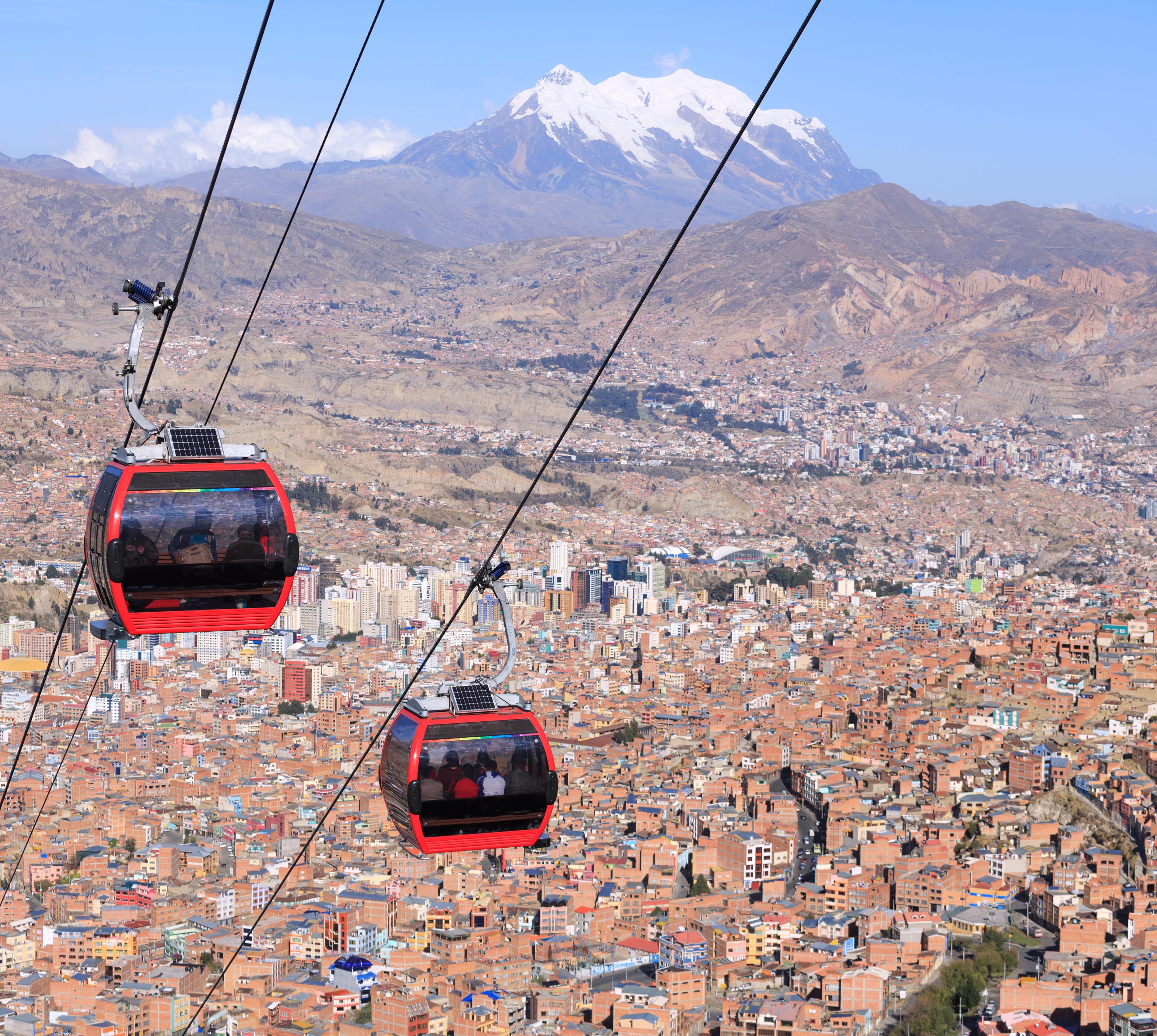 Mit dem größten städtischen Seilbahnprojekt der Welt verbinden sich nun Welten. In nur zwei Minuten werden z.B. die 1200 m Höhenunterschied zwischen La Paz und El Alto überwunden. Zzt. gibt es drei Linien (rot, gelb, grün), weitere sieben sollen folgen.
