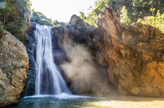 Kleine Badeanstalt, in der du unter dem wie Gardinen über mehrere Terrassen herabstürzenden Wasserfall duschen kannst, im Pool schwimmen und dich anschließend mit dominikanischer Hausmannskost stärken.