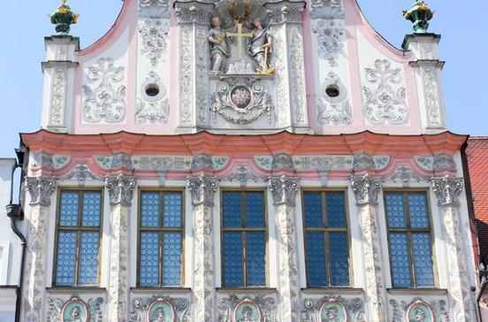 Zartes Rokoko-Bandelwerk schmückt dieses Rathaus, das Dominikus Zimmermann 1719-21 umbaute.