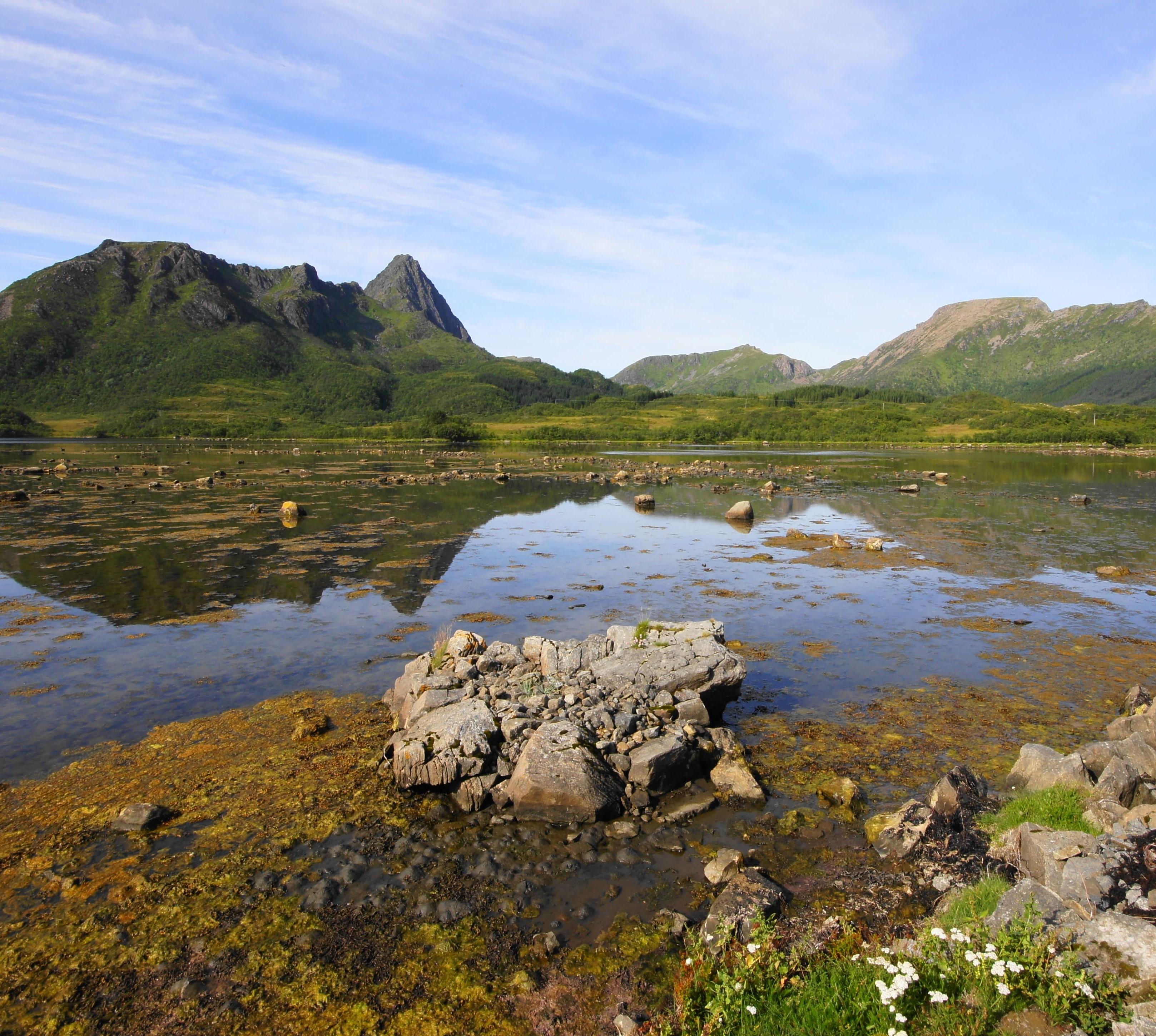 Der Reiz von Langøy liegt in ihrer beeindruckenden landschaftlichen Vielfalt. Sanfte Hügel und grüne Wiesen wechseln sich ab mit dichten Wäldern, stillen Mooren, felsigen Schärenküsten und idyllischen Sandstränden. Mit einer Fläche von 860 km² ist Langøy nicht nur die drittgrößte Insel Norwegens, sondern auch das Herzstück der Vesterålen. Tief ins Land greifende Fjorde teilen die Insel in drei markante Regionen und verleihen ihr eine besondere, dramatische Landschaftsstruktur. Die Gipfel des Inselinneren, die bis zu 800 m aufragen, bieten spektakuläre Panoramen, wie die Insel überhaupt – neben ihren kulturellen Höhepunkten – perfekte Bedingungen für Natur- und Aktivurlauber bietet: Rund 100 markierte Wanderwege erschließen sowohl die zerklüfteten Küstensäume als auch das hochalpine Terrain.