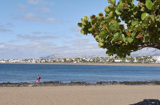 Die Playa de los Pocillos liegt östlich der Playa Blanca und hier herrscht weniger Trubel. Dafür liegt sie aber schon nahe an der Einflugschneise des Flughafens.