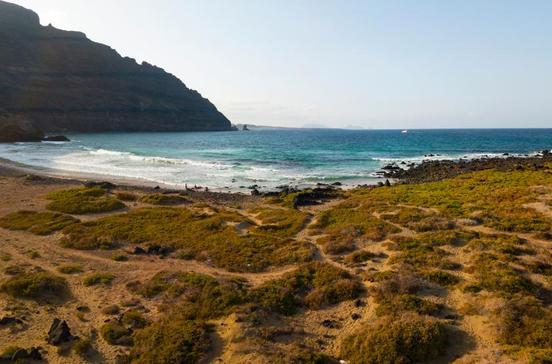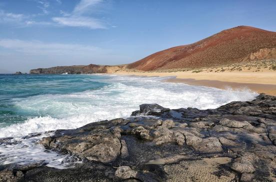 Der Famara-Strand ist der längste auf Lanzarote und auch landschaftlich am schönsten eingebettet: unterhalb des schroffen Famara-Massivs, umgeben von Dünen und dem anbrandenden Atlantik. Es weht oft starker Wind, deshalb sollte man unbedingt die Strandbeflaggung beachten: Rot bedeutet "Baden verboten"! Gefährliche Strömungen fordern jedes Jahr Menschenleben.